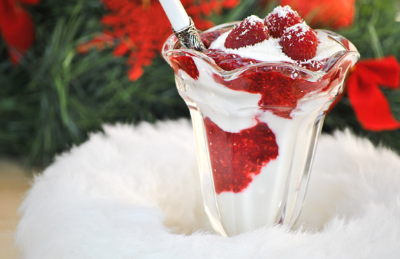 - Servimos combinando a capas con el yogur y decoramos con unas frambuesas y coco rallado para darle el efecto de nieve.