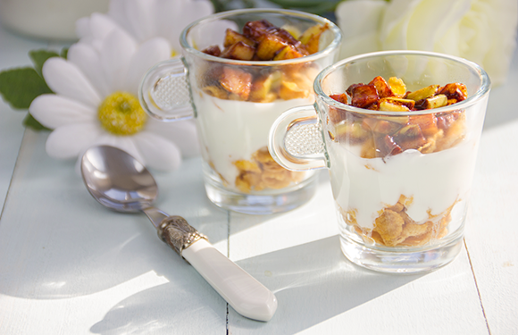 - Ya sólo nos queda montar los vasitos alternando capas de yogur con capas de copos de maíz y de la manzana caramelizada.